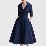 Această rochie are un decolteu în V feminin, cu un corset delicat și o lungime midi elegantă. Talie structurată subliniază forma ta, în timp ce fusta evazată adaugă mișcare și farmec. Proiectată cu mâneci 3/4 și buzunare laterale subțiri, oferă o siluetă atemporală, potrivită atât pentru ocazii informale, cât și pentru evenimente mai elegante.